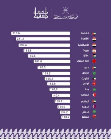 وتعكس هذه النتائج مستوى أفضل من الانسيابية المرورية في مسقط مقارنة بالمدن العربية الأخرى، وفق البيانات التي رصدها المؤشر.