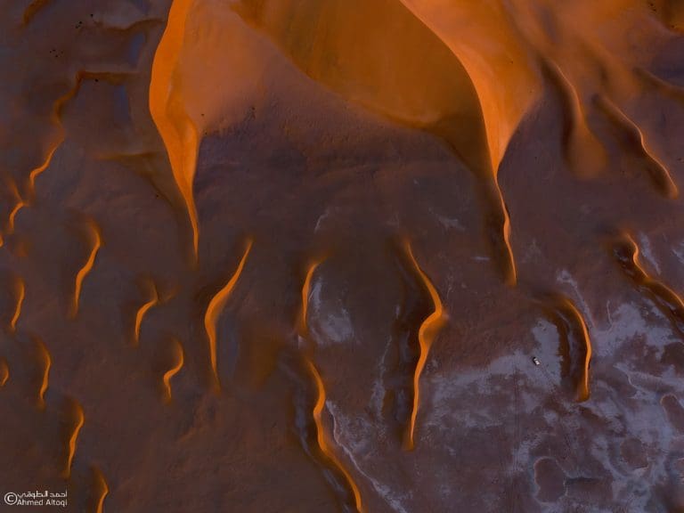 وقال الطوقي: “عند اقتنائي لأوّل (طائرة) درون، ذهبت بها إلى الحشمان، وهناك رأيت زاوية علوية فائقة الجمال للكثبان النجمية الممتدة على مرمى البصر”.