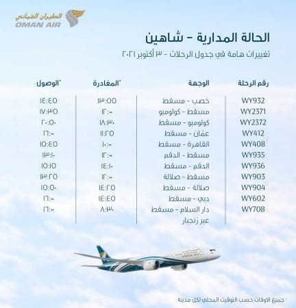 كما أعلن الطيران العماني بأنه نظرا لتأثر حركة الملاحة الجوية جراء الأنواء المناخية الاستثنائية، تقرر إعادة جدولة عدد من الرحلات القادمة أو المغادرة من مطار مسقط الدولي حسب الجدول المرفق.