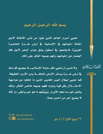 كما وجه سماحة الشيخ أحمد الخليلي تحية للمقاومة الإسلامية بجميع أفرادها في أرض غــــزة وسائر الأرض المحتلة ومن الأردن الشقيقة.