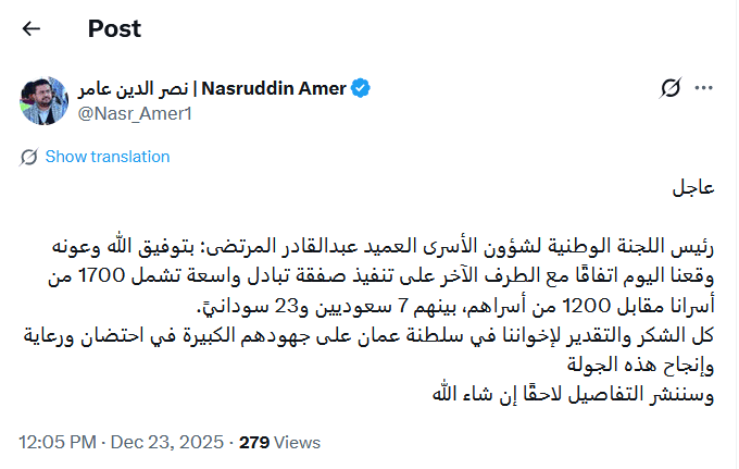 وعقب الاتفاق، وجه رئيس اللجنة الوطنية لشؤون الأسرى العميد عبدالقادر المرتضى، الشكر لسلطنة عمان على جهودهم الكبيرة في احتضان ورعاية وإنجاح هذه الجولة.