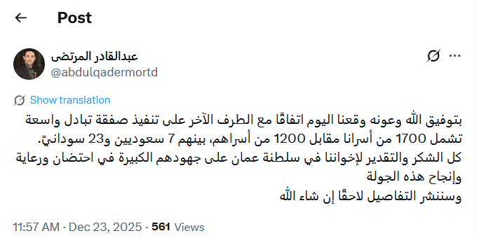 وبموجب اتفاق مسقط ستفرج الحكومة اليمنية عن 1700 أسير حوثي، فيما سيفرج الحوثيون عن 1200 أسير ومحتجز بينهم القيادي في الإصلاح محمد قحطان، و 7 سعوديين و23 سوداني.