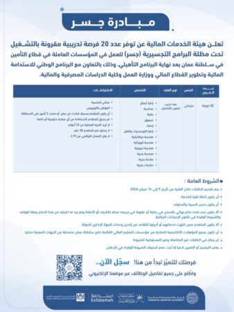 أعلنت هيئة الخدمات المالية عن إطلاق مبادرة جِسر، لتوفير 20 فرصة تدريبية مقرونة بالتشغيل في قطاع التأمين.