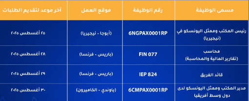 أعلنت وزارة العمل وبالتنسيق مع اللجنة الوطنية العمانية للتربية والثقافة والعلوم عن توفر عدد من الوظائف الشاغرة لدى منظمة الأمم المتحدة للتربية والعلم والثقافة (اليونسكو)