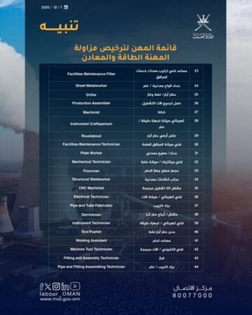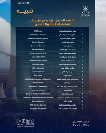وذاك إلحاقًا بالإعلان الصادر حول إلزام العاملين في المهن المحددة بالحصول على ترخيص مزاولة المهنة من خلال الجمعية العُمانية للطاقة – ممثلة بوجدة المهارات القطاعية لقطاع الطاقة والمعادن – كشرط أساسي لإصدار أو تجديد تصاريح العمل اعتبارًا من 1 سبتمبر 2025م.