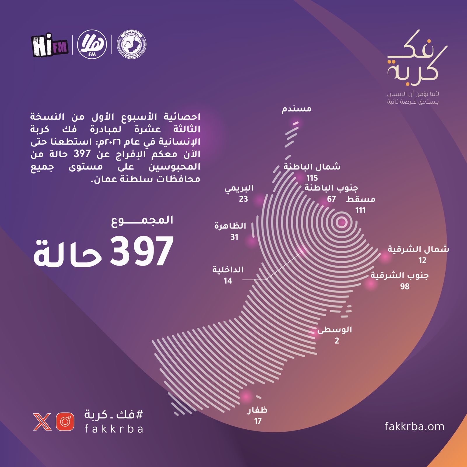 أعلنت مبادرة “فك كربة” أنه تم الإفراج عن 397 حالة حتى الآن ضمن المبادرة الإنسانية، بفضل تكافل المجتمع وكرم الأيادي البيضاء.