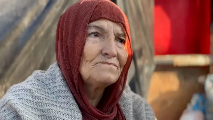 تجلس المسنة الفلسطينية فتحية الشامي أمام خيمتها الصغيرة التي تؤويها، بعد نزوحها من خان يونس في قطاع غزة، عقب إخراجها من تحت ركام منزلها الذي قصفه الاحتلال الإسرائيلي.