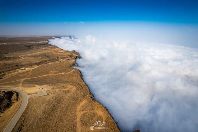 مشهد يحبس الأنفاس.. قمة “جبل سمحان” تعانق السحاب في مشاهد خلابة
