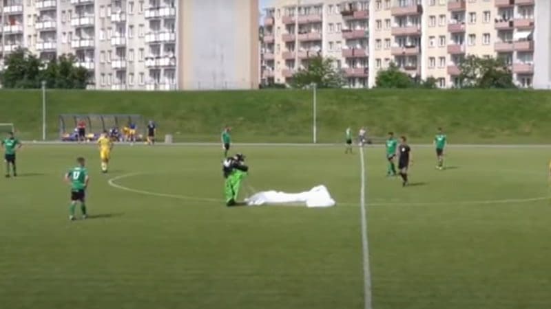 حط المظلي الرحّال بعد رحلة جوية نفّذها في سماء البلاد داخل أحد الملاعب البولندية، الأمر الذي اضطر الحكم لإيقاف اللعب بشكل عاجل.