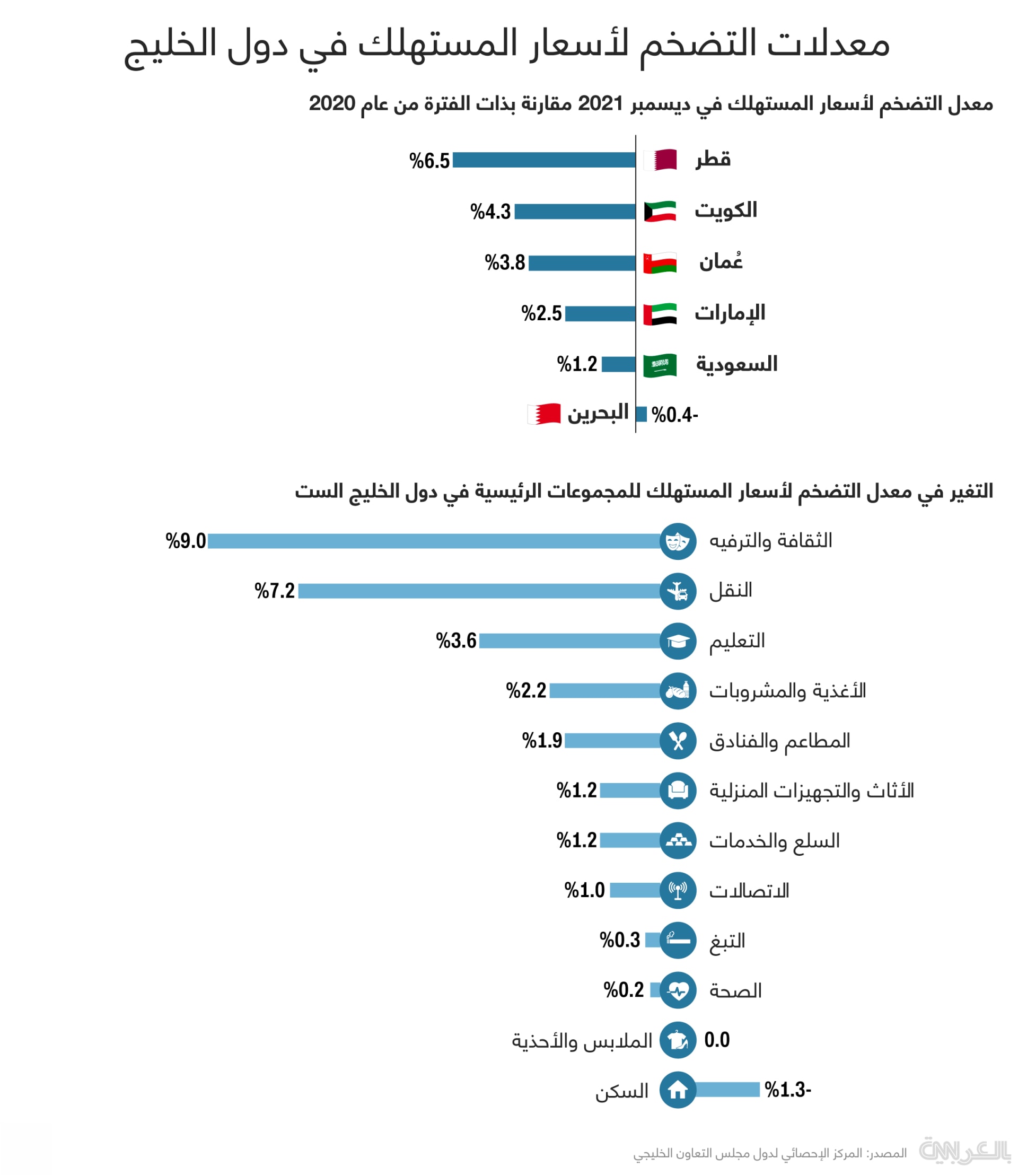 إليكم نظرة في الإنفو غرافيك أعلاه على معدل التضخم في شهر ديسمبر2021 مقارنة مع ذات الفترة لعام 2020 في دول الخليج، إضافة إلى نتائج معدل التضخم وفقًا للمجموعات الرئيسية.