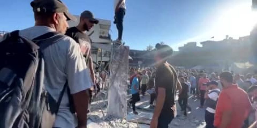 استهدفت غارة إسرائيلية مجمعاً مدرسياً بالقرب من خان يونس في قطاع غزة حيث كان الآلاف من النازحين الفلسطينيين يحتمون ويحضرون مباراة لكرة القدم في باحة المدرسة. ركض الناس للنجاة بحياتهم، وعلت صرخات النساء والأطفال وتناثرت الجثث على الأرض.