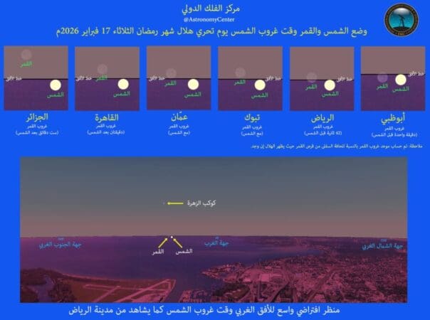الصورة المرفقة تبين وضع الشمس والقمر وقت غروب الشمس يوم تحري هلال شهر رمضان الثلاثاء 17 فبراير 2026م، بحيث إن الخط الأسود هو الأفق، والقرص الأصفر هو قرص الشمس لحظة اكتمال غروبها، والقرص الرمادي الباهت هو قرص القمر، ويتضح من الصور أن الجزء السفلي من القمر يبدأ بالغروب قبل غروب الشمس في العديد من مناطق العالم العربي.